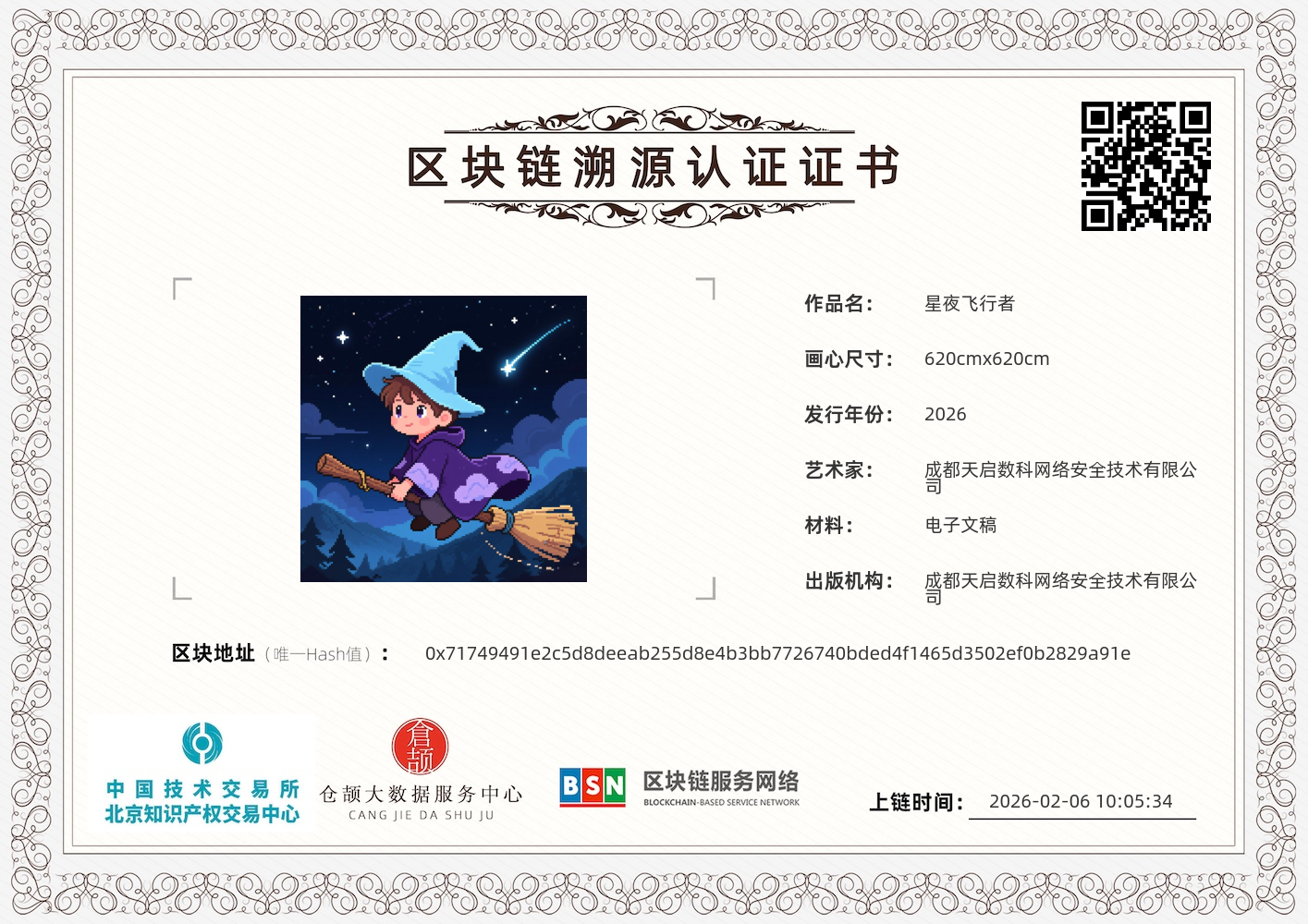 《星夜飞行者》是一幅像素风数字艺术作品,以 “童真奇幻与星空冒险” 为核心创作主题。 画面以深邃的靛蓝夜空为底色,细碎星子与划破天际的流星为背景注入灵动的梦幻感;前景中,身着蓬松紫色斗篷、头戴浅蓝巫师帽的小巫师正稳稳骑在飞天扫帚上,圆润的像素笔触勾勒出软萌神态,嘴角浅笑传递着飞行时的轻松愉悦;下方的山林剪影在夜色里若隐若现,为这场空中冒险铺垫了静谧的舞台。 作品以复古像素美学为载体,通过高饱和度的蓝紫撞色与细腻的像素颗粒,营造出兼具怀旧电子质感与童话氛围的视觉效果。它不仅还原了童年幻想里 “巫师飞行” 的浪漫场景,更以明快色彩与软萌形象传递出无畏探索的童真勇气,唤起观者对奇幻冒险的向往与对纯粹童趣的怀念。