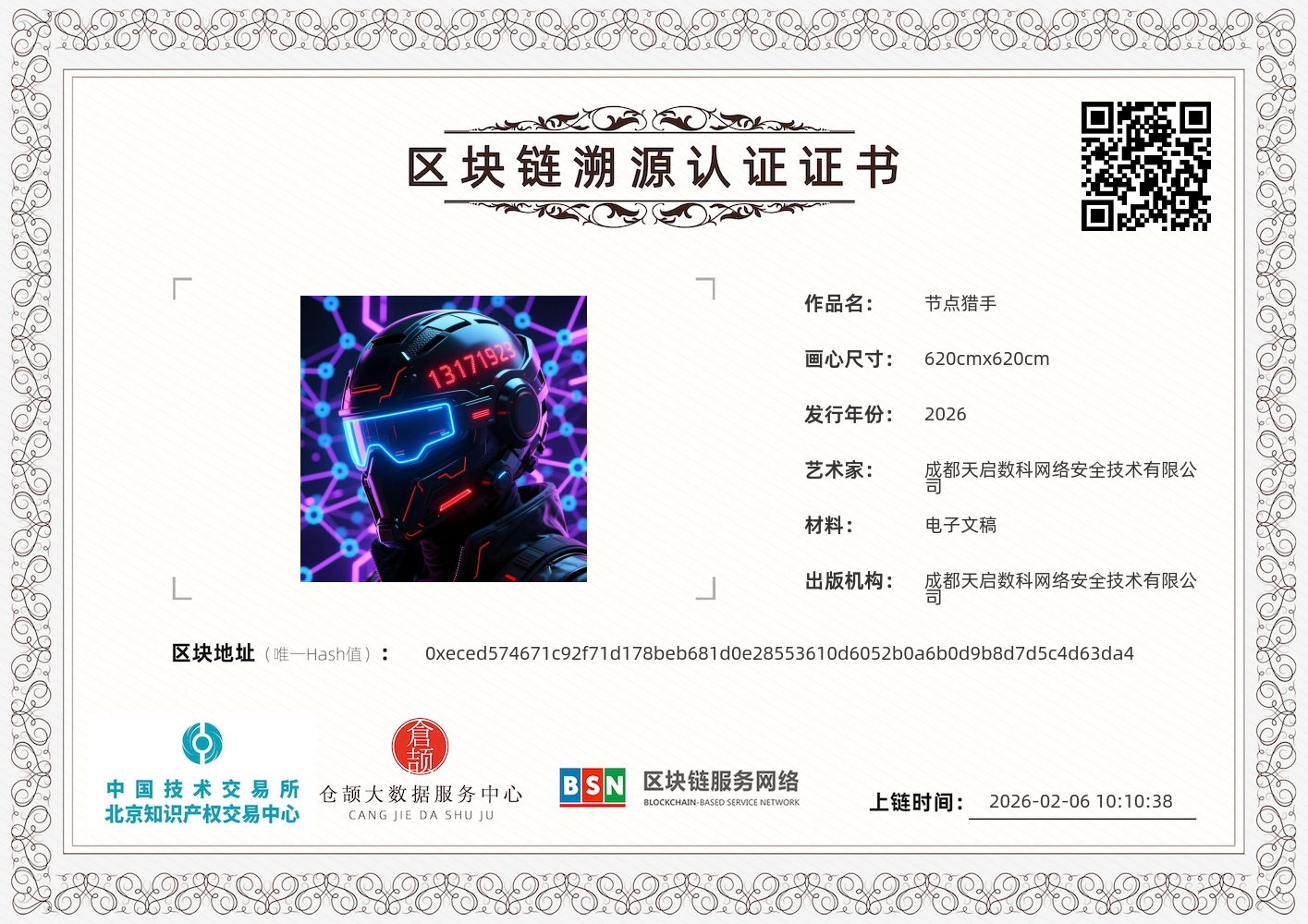 《节点猎手》是一幅赛博朋克风格的数字艺术作品,以 “赛博空间中的身份隐匿与数据潜行” 为核心创作主题。 画面主体是一具极具未来感的战术头盔,哑光黑色外壳上布满红色霓虹线条,勾勒出冷峻的机械棱角;蓝色光效的全息护目镜彻底遮蔽面部,强化了身份的隐匿性;头盔顶部的红色数字编码 “13171923” 如同专属标识,暗喻着赛博世界里个体的数字身份。背景由紫色与蓝色交织的网络节点与连线构成,如流动的数字矩阵,为整个场景铺垫了充满科技张力的氛围。 作品以高对比度的红、蓝、紫撞色为视觉核心,结合金属质感的机械细节与流动的网络符号,精准还原了赛博朋克的冷峻美学。它不仅塑造了一个潜行于数字网络中的猎手形象,更以编码与隐匿的视觉符号,引发观者对信息时代个体身份、数据隐私,以及人类与数字空间共生关系的思考。